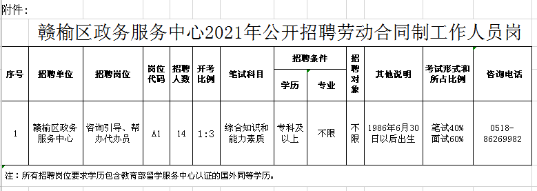 由于工作需要,赣榆区政务服务中心拟面向社会公开招聘劳动合同制工作人员(咨询引导、帮办代办员)14名,有关事项公告如下: